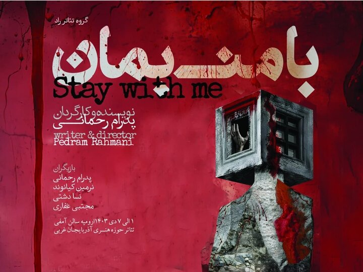 نمایش “با من بمان” به نویسندگی و کارگردانی پدرام رحمانی، از ابتدای زمستان سال جاری در سالن آمفیتئاتر ماه حوزه هنری آذربایجان غربی به روی صحنه رفت. این اثر نمایشی که به موضوع مقاومت مردم فلسطین در برابر جنایات رژیم صهیونیستی میپردازد، از میان ۵۴۰ نمایشنامه ارسالی به نوزدهمین جشنواره بینالمللی تئاتر مقاومت انتخاب شده و به مرحله نهایی راه یافته است.